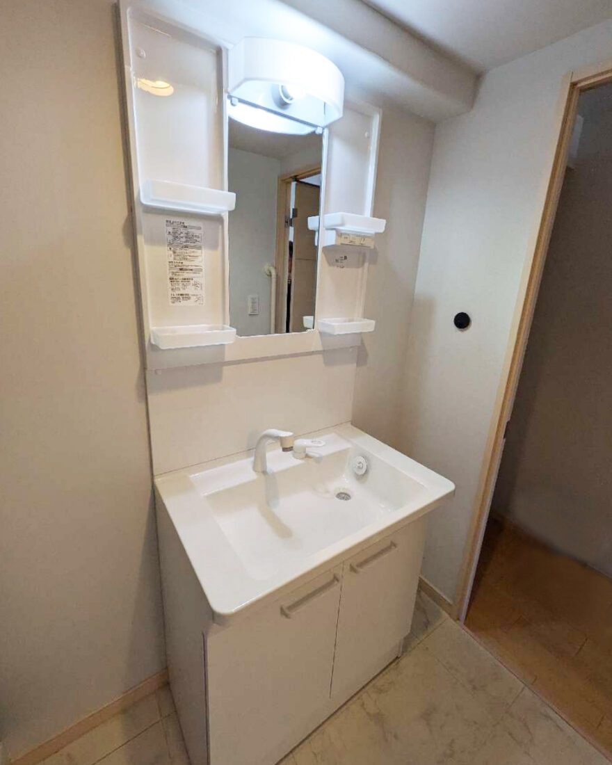 お求めやすさと使いやすい機能が備わった、TOTOのVシリーズへ交換。大きな鏡とLEDライトで、毎日の身だしなみチェックもしやすくなりました。