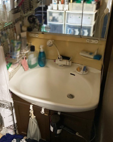 - 洗面台:Vシリーズ(TOTO ) 壁:RE55296(サンゲツ) 床:FS4249(東リ)
