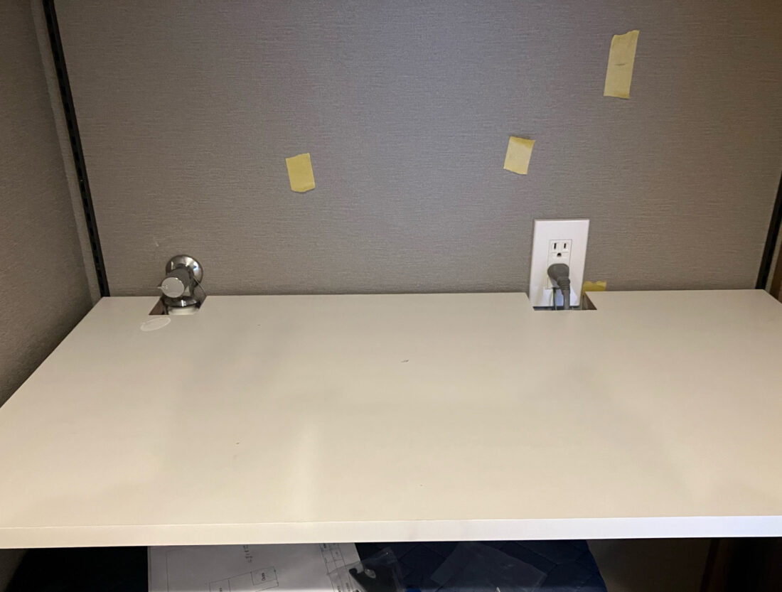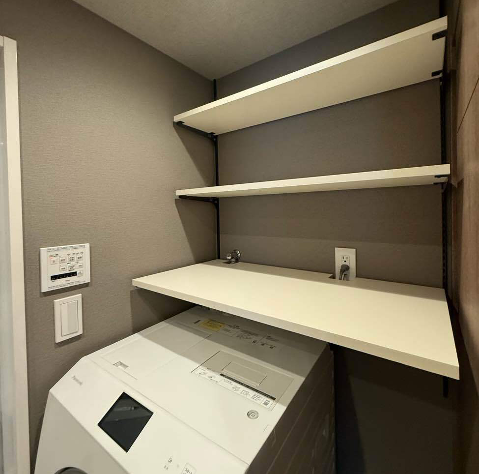 洗濯機上の棚は、コンセント位置や水栓との干渉を避けられるよう欠き込み加工を施しご希望の高さに、さらに上段は奥行きを抑えた使い勝手の良い形で設置することができました✨