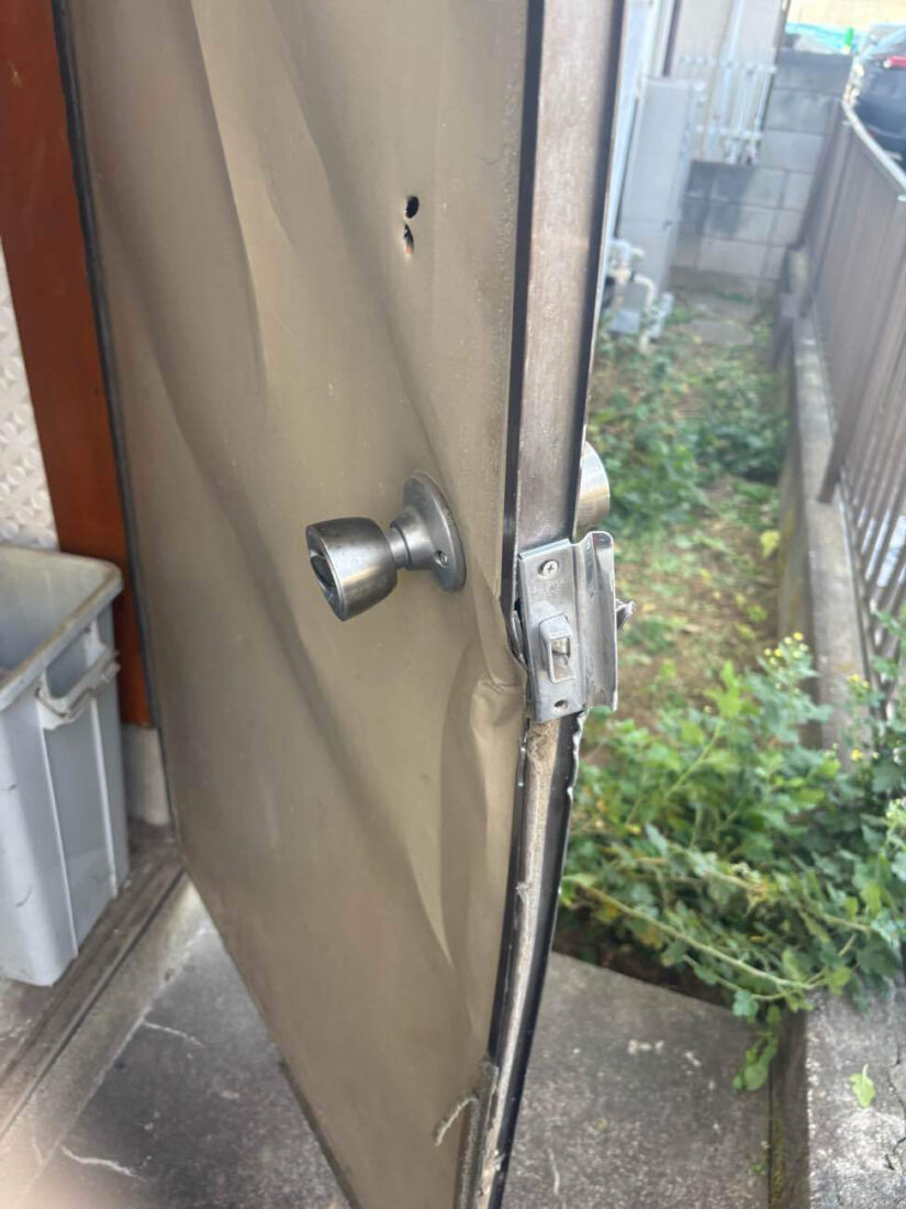 空き巣被害により勝手口ドアの鍵が壊され、扉自体も大きく変形してしまいました。