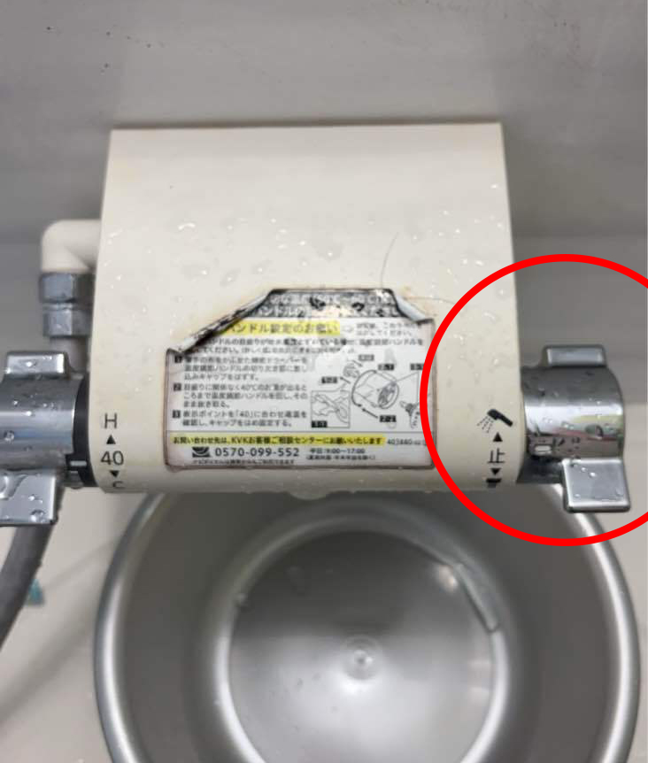 浴室の水栓ハンドル(写真の〇)が外れてしまい、お湯や水が出せない状態でした。