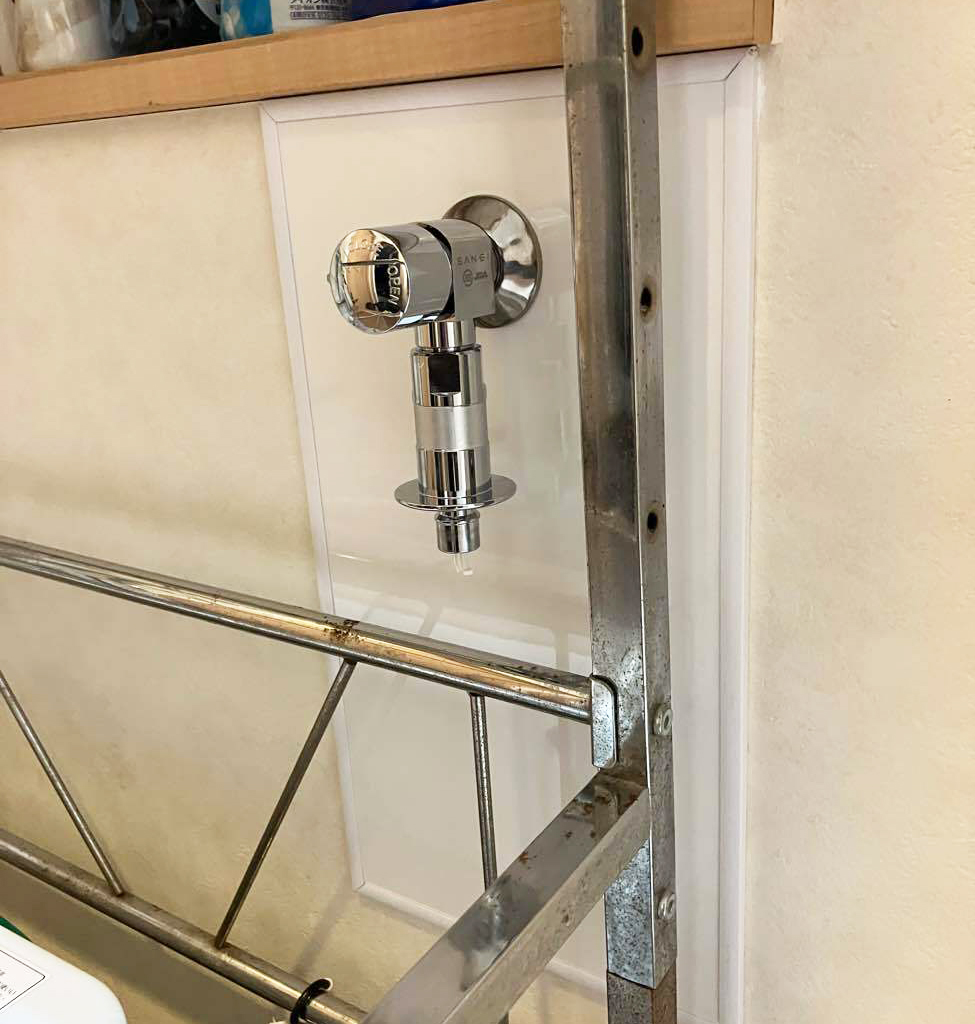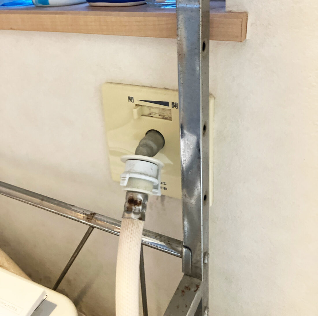洗濯水栓の根元からわずかな水漏れがあり、水栓交換を行いました。