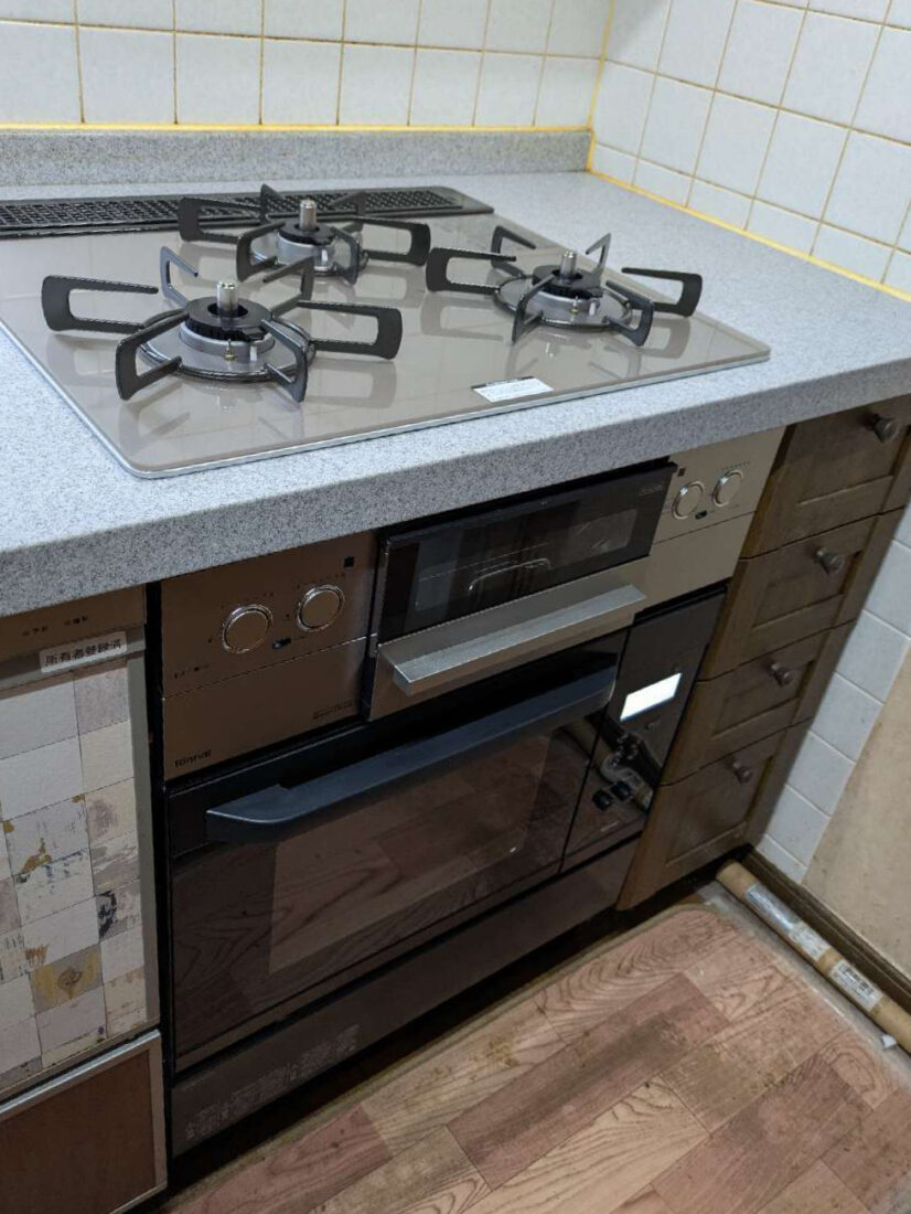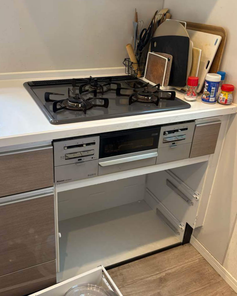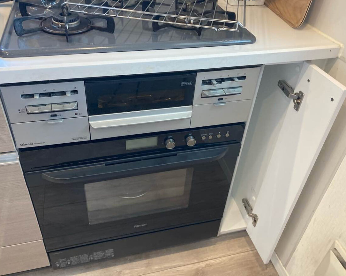木製キッチンにガスオーブンを設置したいとご相談をいただきました。ガスオーブン設置の際、右側に隙間が空いてしまうため、収納として使えるようにしました😄